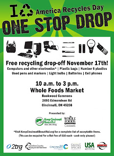 A good example of local businesses' involvement was last year's America Recycles event. Many difficult-to-recycle items were accepted at Whole Foods, and 2TRG and the Cincinnati Zoo were also partners, as described in this flyer: